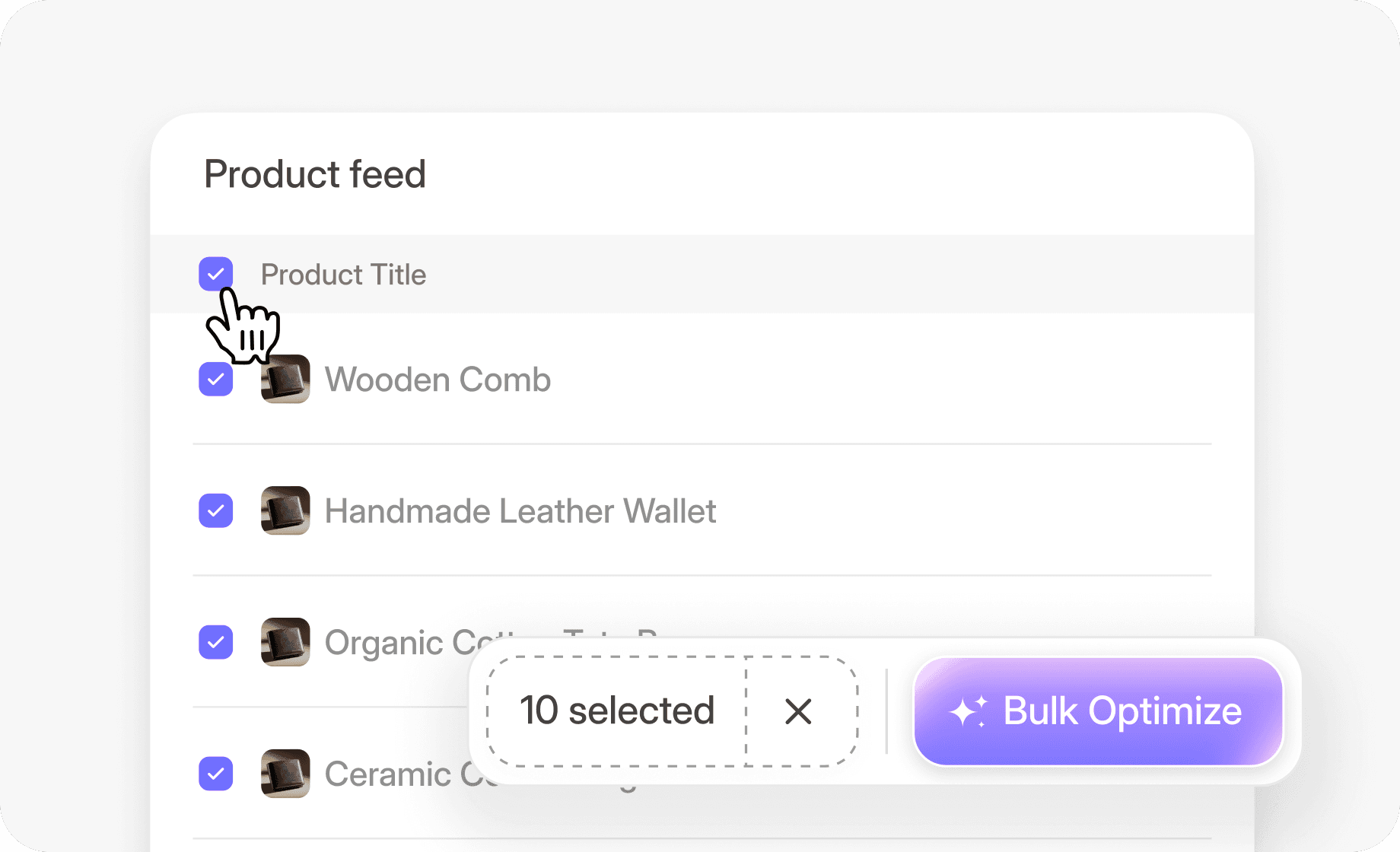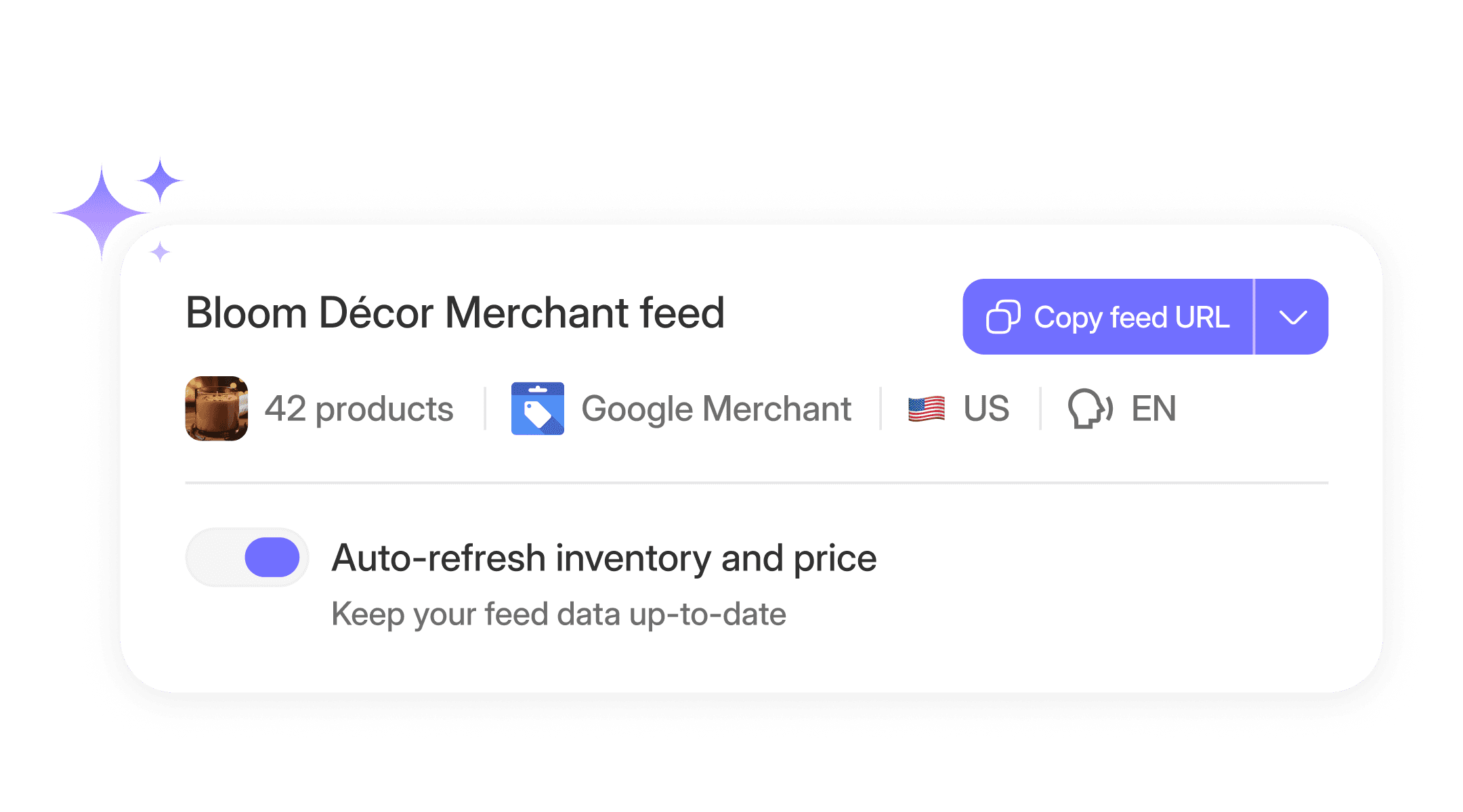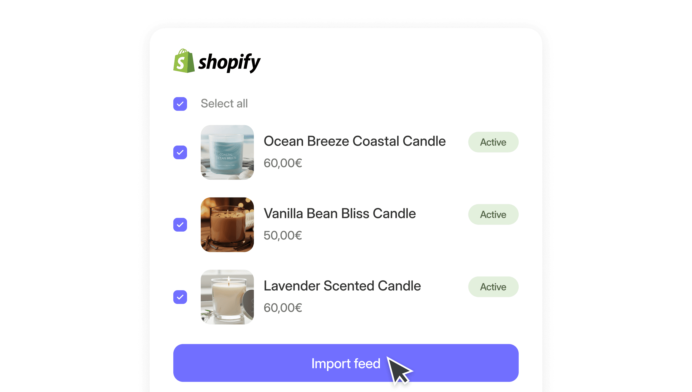 Generate a complete, ready-to-use Shopping feed in minutes — including titles, descriptions, and images.