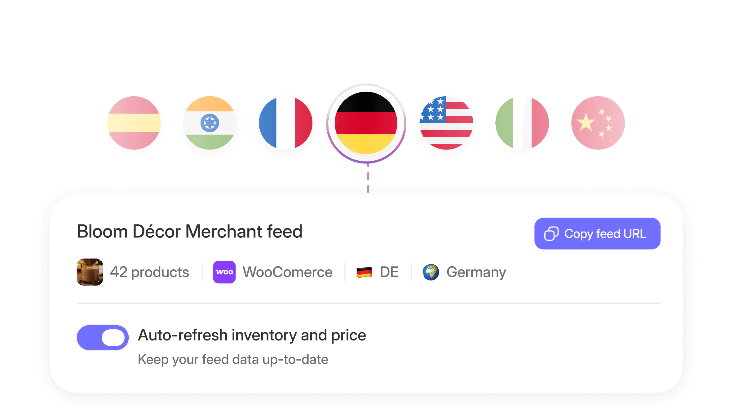 Go global effortlessly. Create localized feeds per country and language for international SEO and ads.