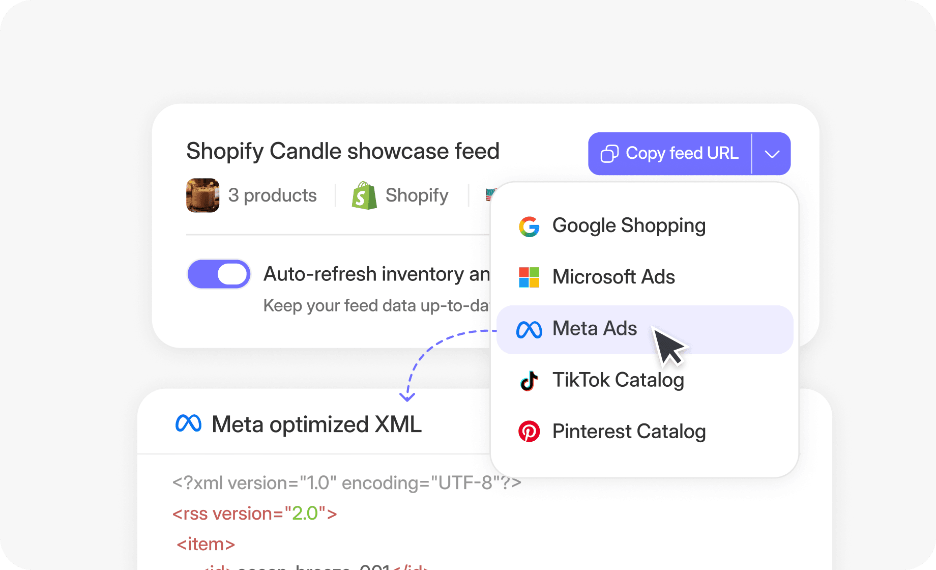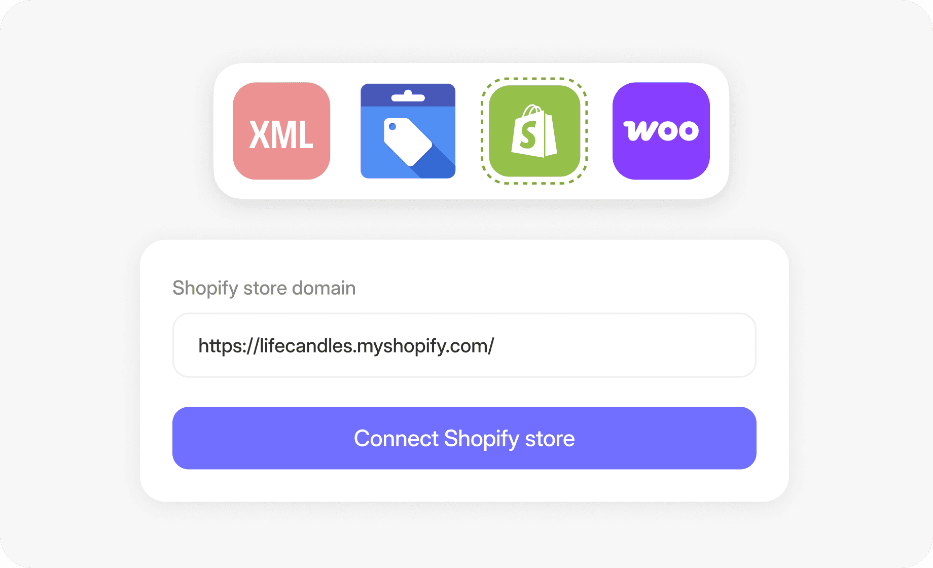 Import from XML, connect your Merchant Center, or link Shopify or WooCommerce directly.
